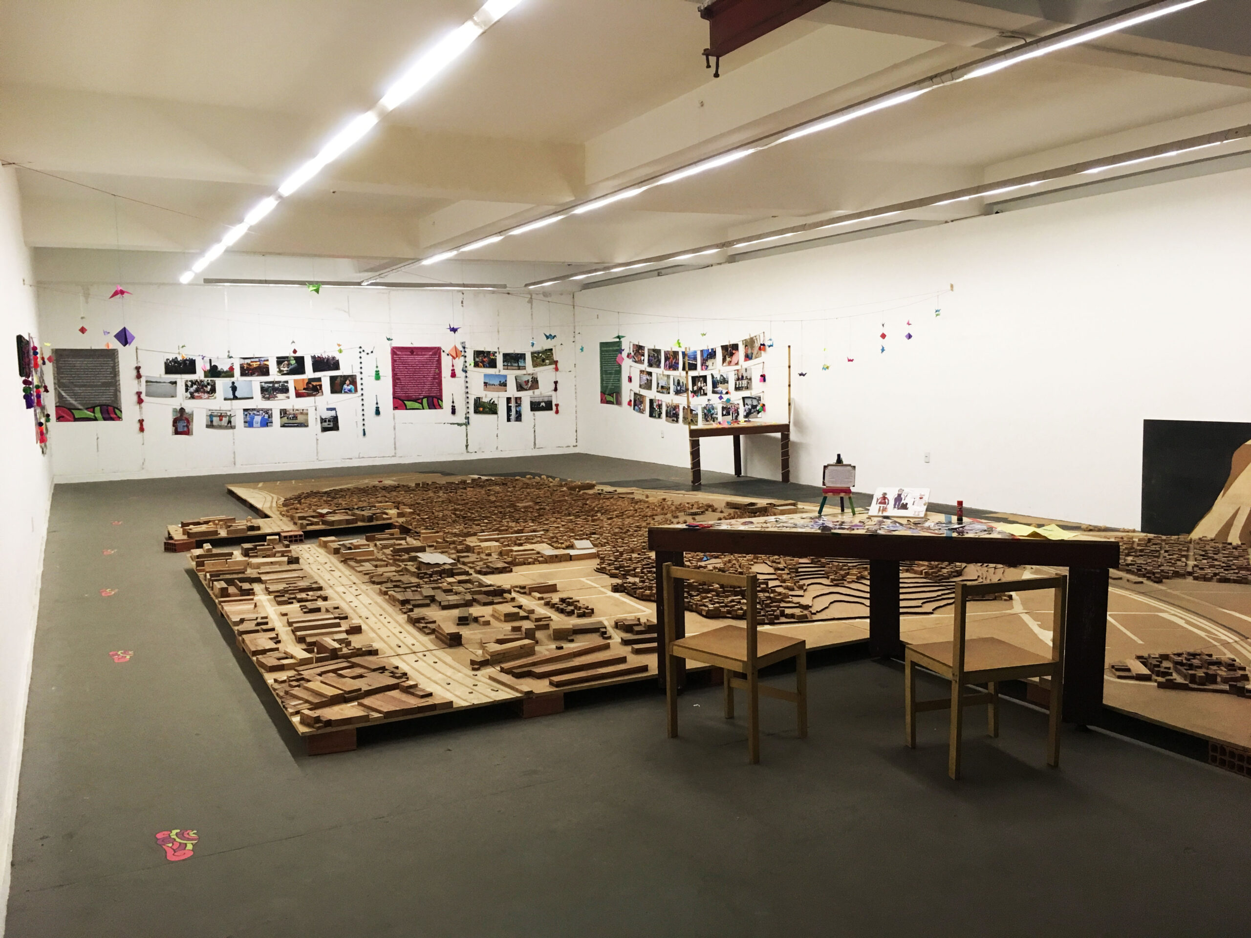 Cuando llegamos a aquél espacio lo primero que nos impresionó fue la maqueta de Maré; por lo menos un día antes ya habíamos caminado sus calles, ya habíamos tenido muchas sorpresas, ya habíamos bailado, ya habíamos intercambiado varias sonrisas con las personas en las calles de Parque Unión y Nova Holanda. Fue por eso que de pronto ver la maqueta nos robó varios suspiros y por supuesto la curiosidad de querer saber más sobre ese territorio.