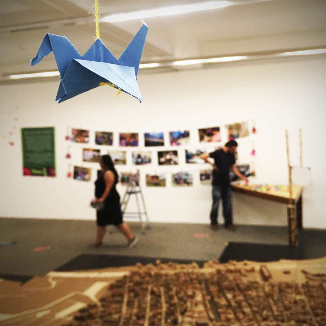 Por si fuera poco decenas de pajaritos de papel (grullas migrantes) fueron puestos encima de la maqueta, como si estuvieran volando sobre Maré, ya que en vez de helicópteros lanzando balas, los pájaros simbolizan la posibilidad de llevar mensajes de solidaridad, justicia y dignidad.