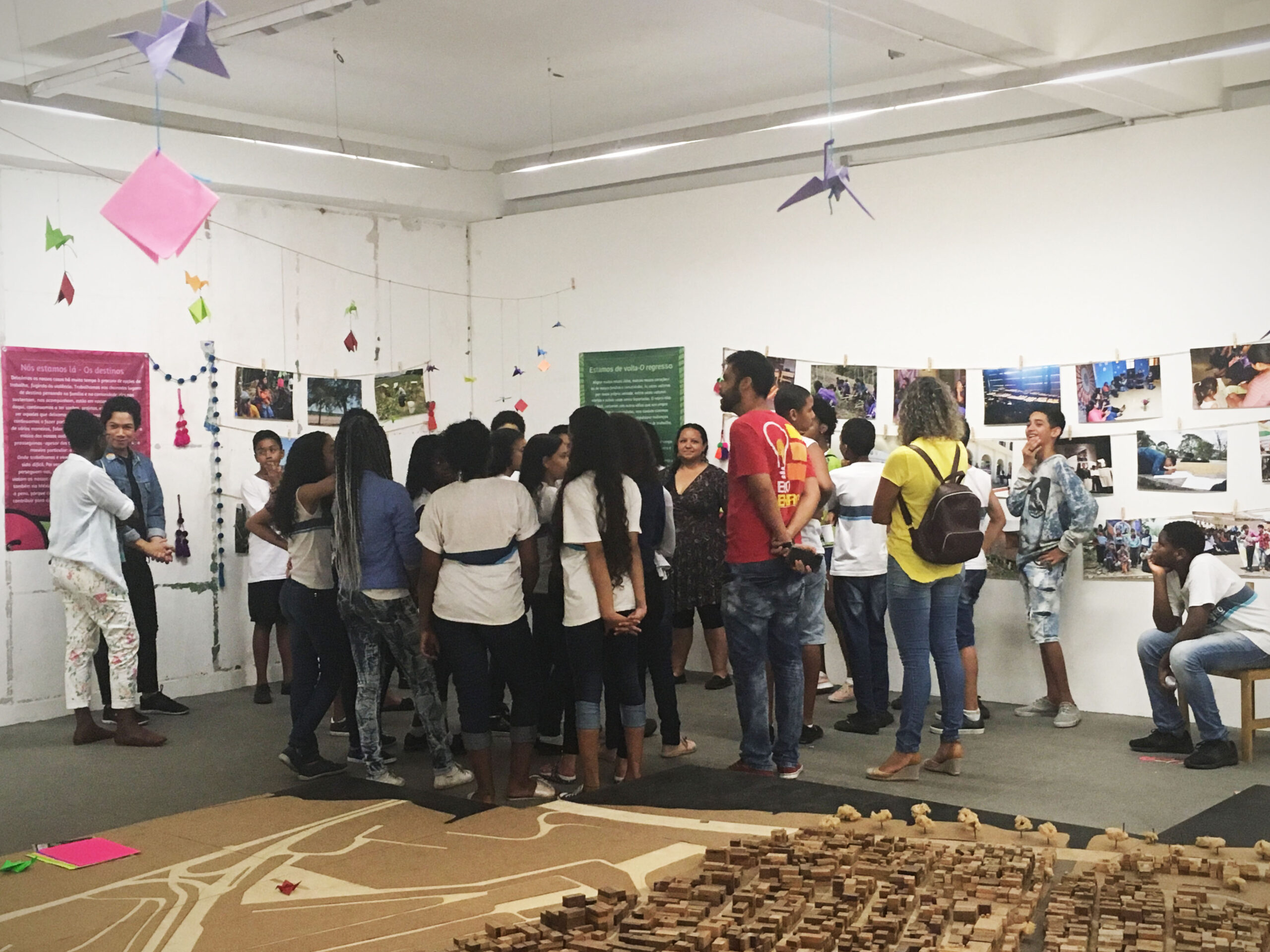 Niñas, niños y jóvenes intercambiando en el MuMi y con ello la posibilidad de construir la memoria más allá del “sólo observar”. Cada encuentro fue planeado para hacer una actividad, primero reconociendo qué significa migrar, dónde vivimos, dónde nacimos y dónde nacieron nuestros padres y abuelxs; nos fuimos ubicando en cada encuentro en un mapa gigante imaginario y descubrimos juntos las migraciones principalmente del Nordeste brasileño a Río de Janeiro y particularmente a Maré.